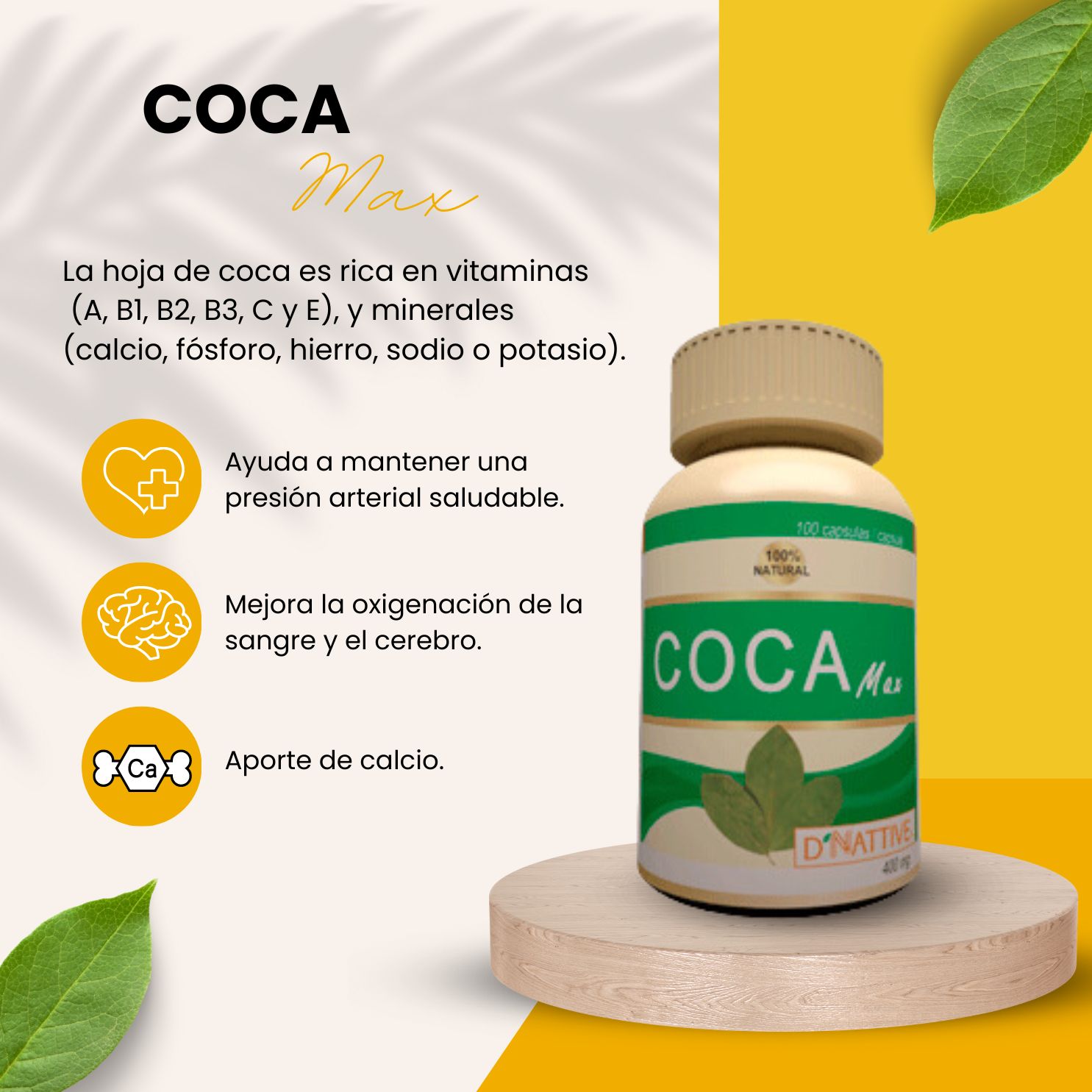 La hoja de coca es rica en vitaminas (A, B1, B2, B3, C y E), y minerales (calcio, fósforo,