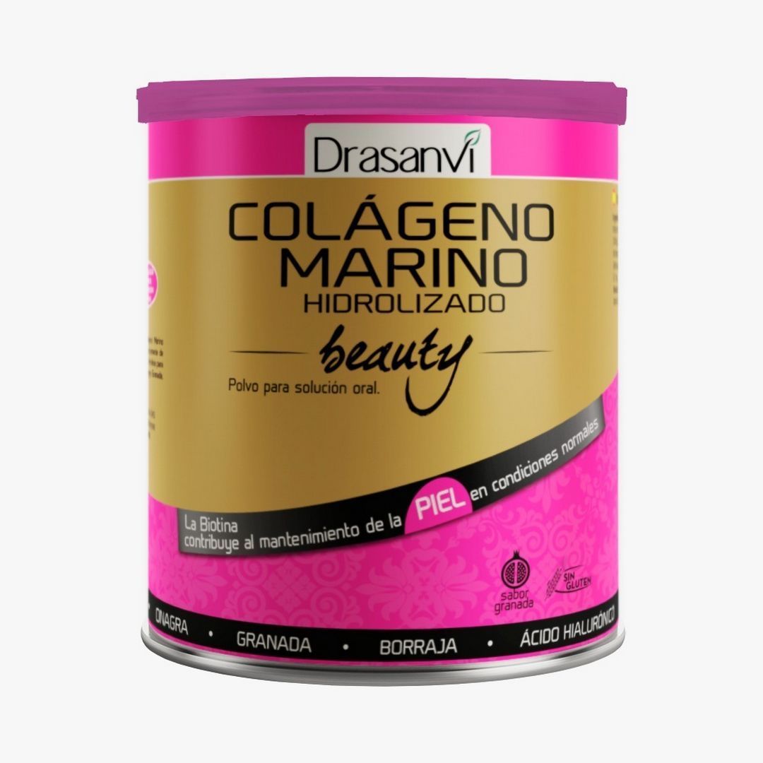 Composición Colágeno Marino Hidrolizado Enzimaticamente(Contiene PESCADO,Tipo I. muy bajo peso molecular)8686 mg, Aroma(Aroma granada), Extracto seco de Acerola(Fruto) (Malpighia punicifolia, Vitamina C al 25%)320 mg, Aceite de Onagra microencapsulada(Semilla) (Oenothera biennis L.)250 mg, Zumo concentrado de Granada(Fruto) (Punica granatum L.)200 mg, Aceite de Borraja microencapsulada(Semilla) (Borago officinalis L.)100 mg, Remolacha(Raíz) (Beta vulgaris L.)50 mg, Ácido Hialurónico 10 mg, D- Biotina(Biotina)100 µg