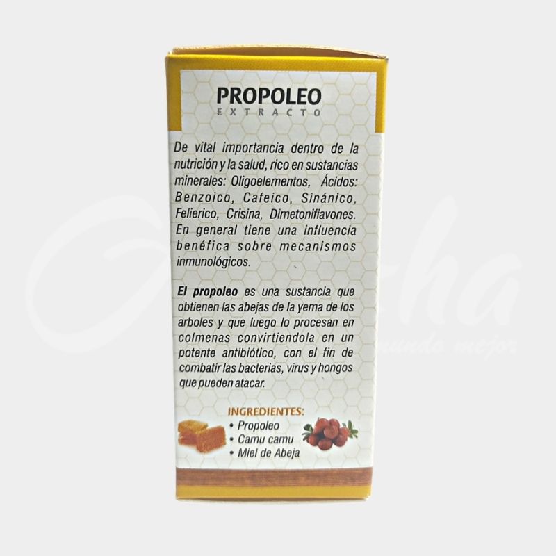 El propoleo es una sustancia que obtienen las abejas de la yema de los arboles y que luego lo procesan en colmenas convirtiendola en un potente antibiótico,con el fin de combatir las bacterias,virus y hongos que pueden atacar.