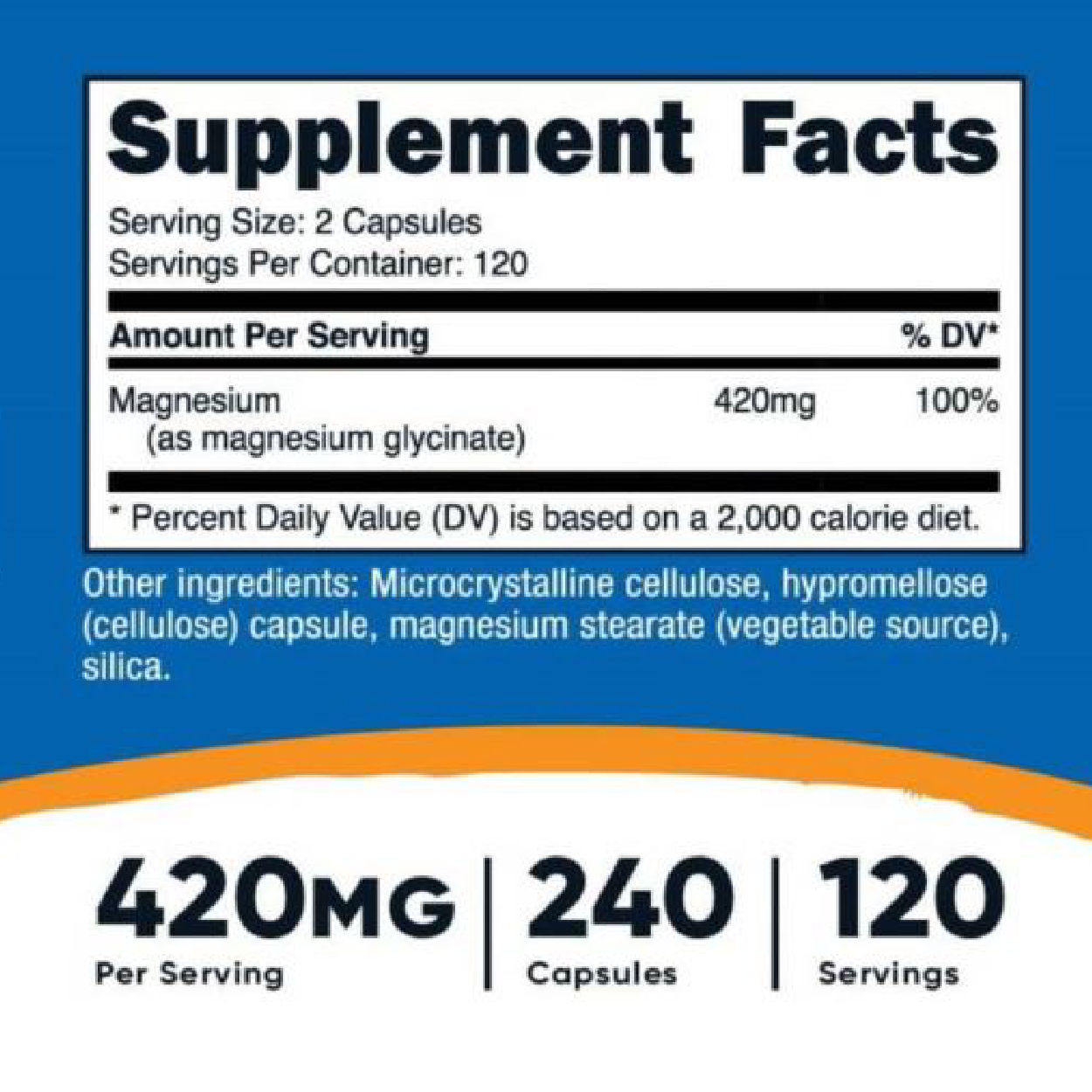 El glicinato de magnesio Nutricost contiene 420 miligramos de magnesio (de glicinato de magnesio) en cada porción. 240 cápsulas para 120 porciones por botella. Nutricost, ubicado y con sede en los Estados Unidos, solo utiliza los mejores ingredientes para una máxima calidad y para ayudarte a sentirte lo mejor posible. Al mantener nuestras recetas de suplementos simples y limpias, obtienes la mejor experiencia posible con Nutricost. Nuestros suplementos se fabrican en una instalación compatible con GMP y registrada por la FDA, y cada lote de cada producto es probado por laboratorios independientes acreditados por ISO. Estas declaraciones no han sido evaluadas por la Administración de Alimentos y Medicamentos. Este producto no está destinado a diagnosticar, tratar, curar o prevenir ninguna enfermedad.