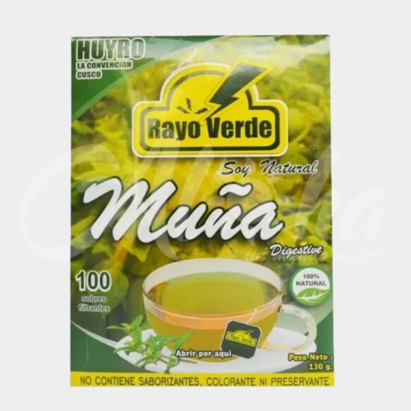 Muña digestive Rayo Verde ,cuenta con diferentes propiedades medicinales. se encarga de eliminar parásitos intestinales , disminuye la aparición de problemas visuales tales como : las cataratas , miopía y degeneración muscular asimismo. ayuda a mantener la agudeza en la visión y por ultimo previene diversos problemas respiratorios y combate la gastritis.