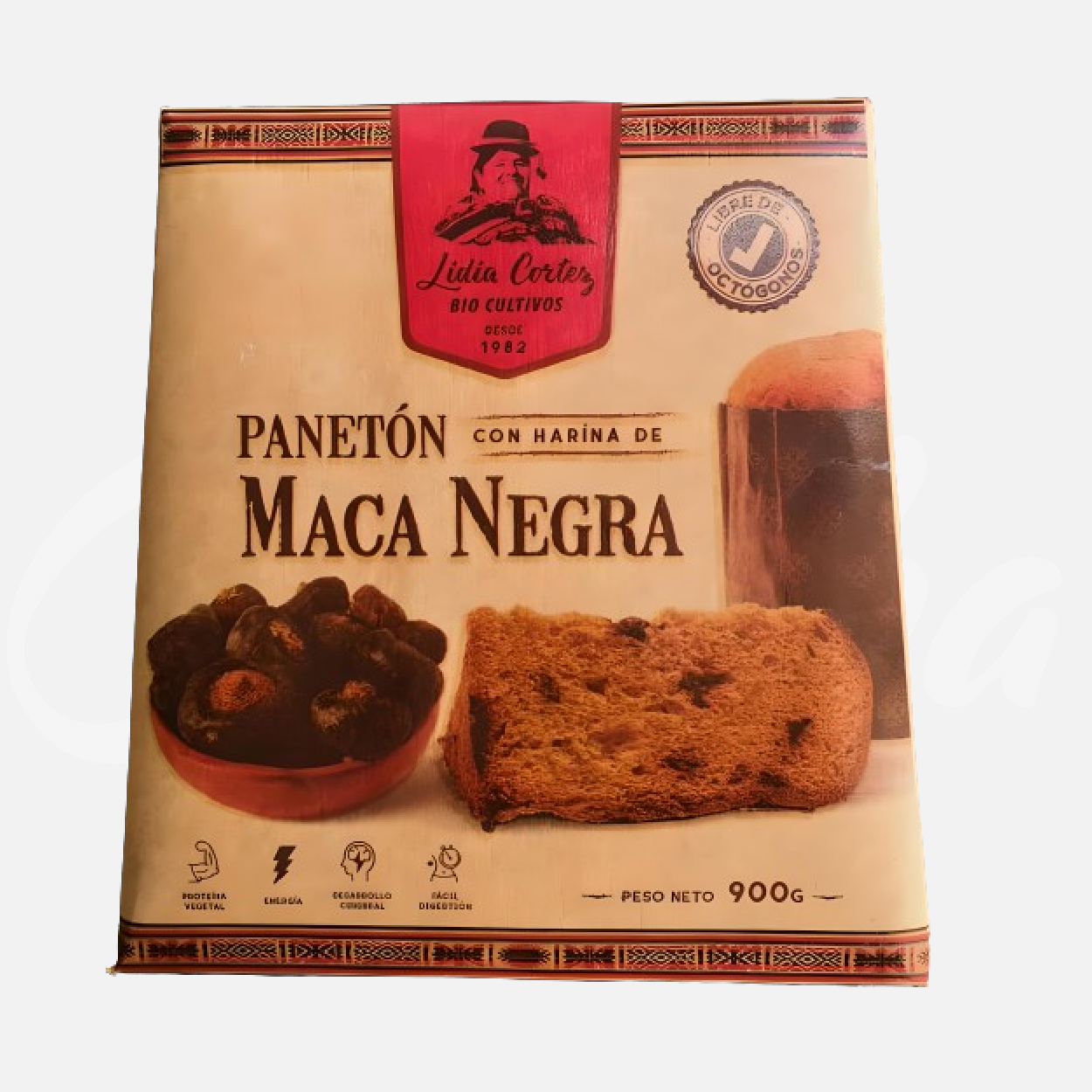 Es un paneton artesanal a base de harina de maca negra, que te brinda proteína vegetal, energía, desarrollo cerebral y fácil digestión.