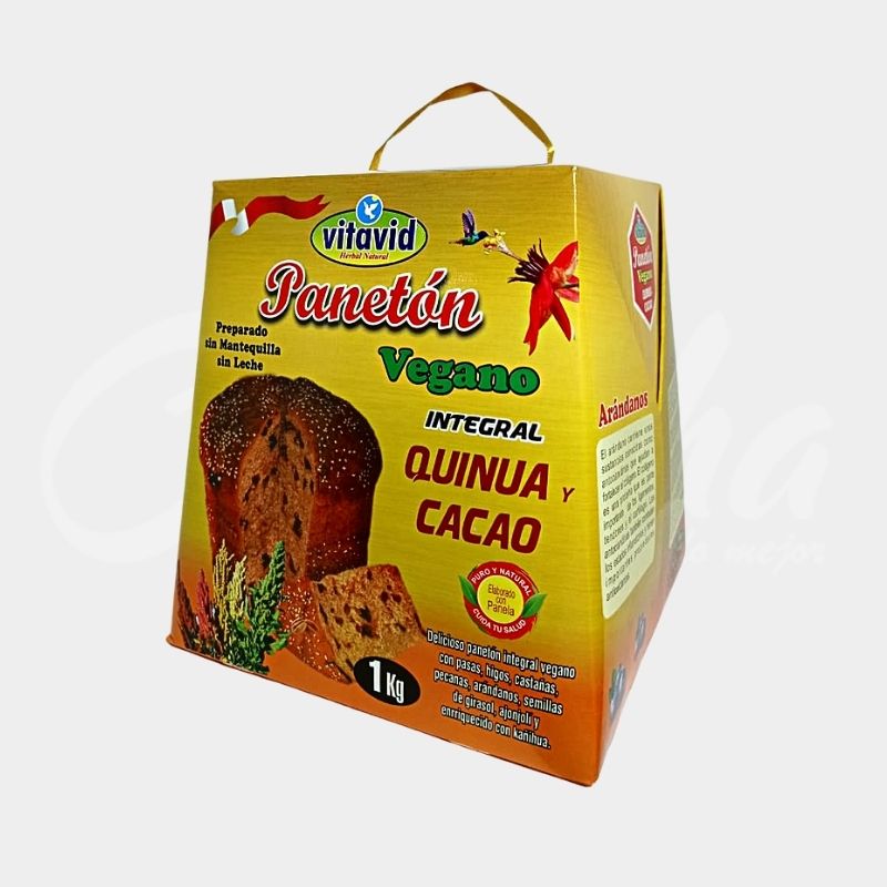 Paneton Vegano con Quinua y cacao Caja 1 kg a base de harina de quinua con deliciosos frutos secos, una gran fuente de nutrientes y fibra para el organismo.